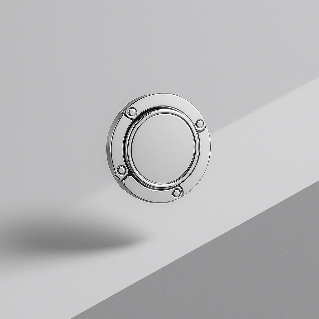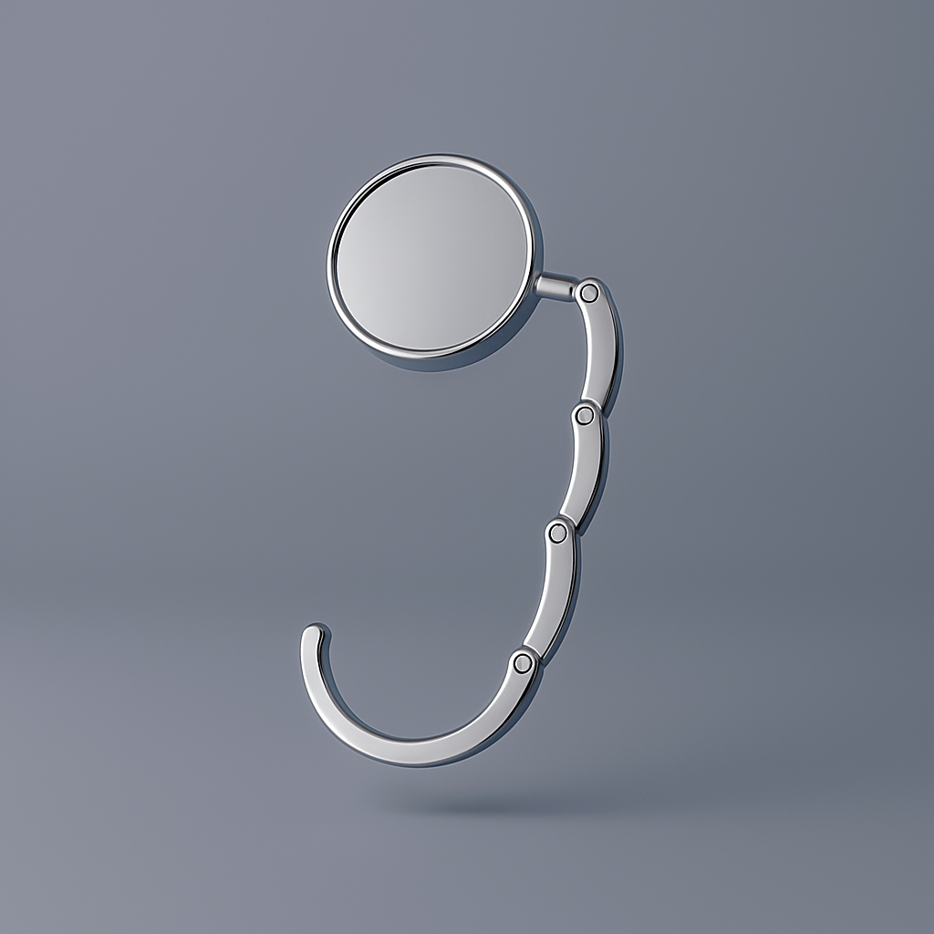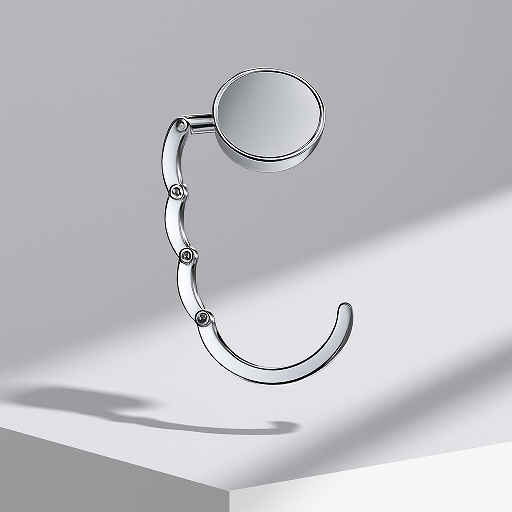 A polished chrome purse hook that folds into a stylish disc when not in use and unfolds into a sturdy hanger for your bag. Keep your essentials safe, clean, and always within reach — with elegance in every detail.